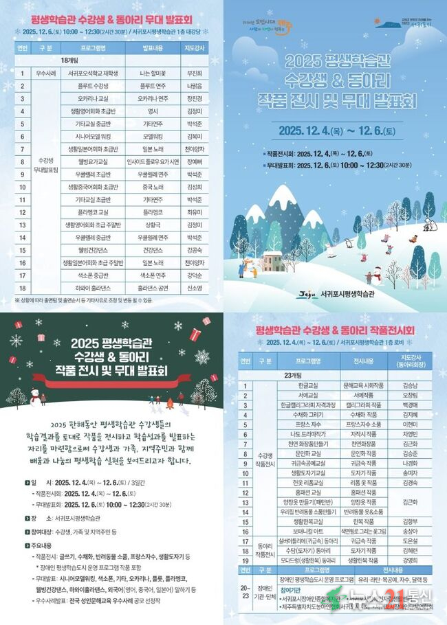 서귀포시는 12월 4일(목)부터 6일(토)까지 평생학습관에서 수강생들이 한 해 동안 배우고 익힌 성과를 선보이는 ‘2025년도 서귀포시 평생학습관 수강생 작품전시회 및 무대발표회’를 개최한다.