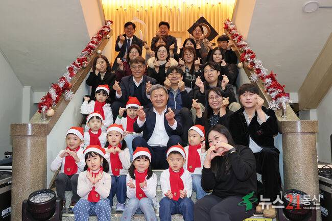 어린이집 원아 9명이 캐롤을 선보이고 참석자들이 함께 노래하며 따뜻한 분위기를 만들었다.