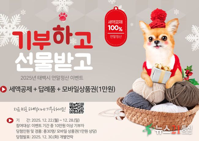 태백시는 연말정산 시즌을 맞아 고향사랑기부제 관심과 참여 확대를 위해 「2025 태백 고향사랑 응원 이벤트」를 12월 22일부터 28일까지 7일간 진행한다고 밝혔다.