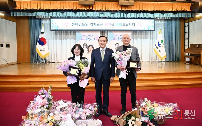 북구는 19일 구청 대회의실에서 하반기 공무원 퇴임식을 열었다. 박천동 북구청장이 전순희 서기관, 조수현 사무관에게 공로패를 전달한 후 기념촬영을 하고 있다.