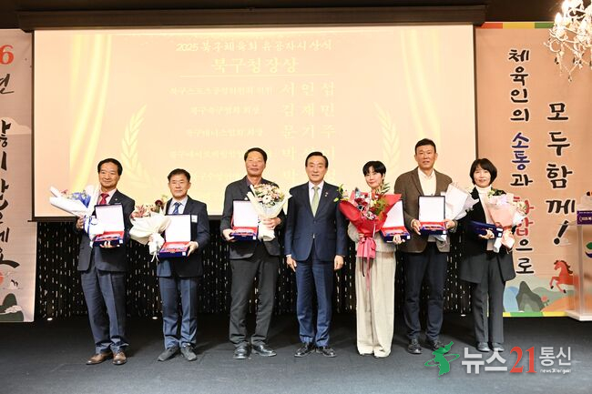 박천동 북구청장은 19일 연암컨벤션에서 열린 북구체육회 유공자 시상식에서 체육발전 유공자에게 구청장 표창패를 수여한 후 기념촬영을 하고 있다.