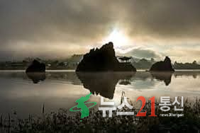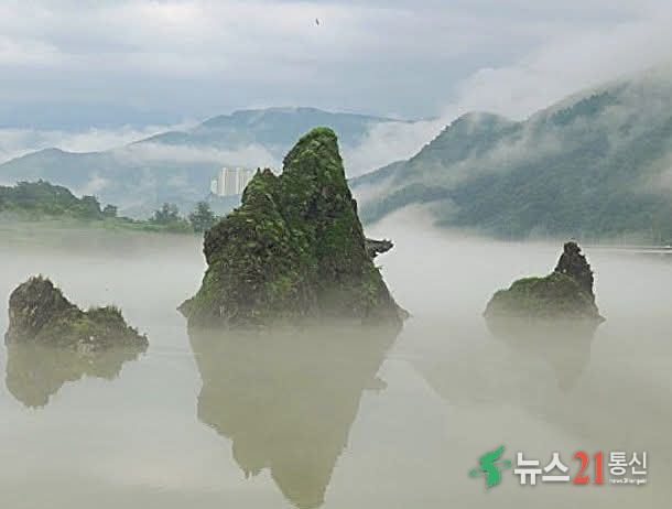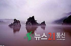 충북 단양의 도담삼봉은 남한강 위에 솟아 있는 세 개의 기암 봉우리로 이루어진 절경입니다.