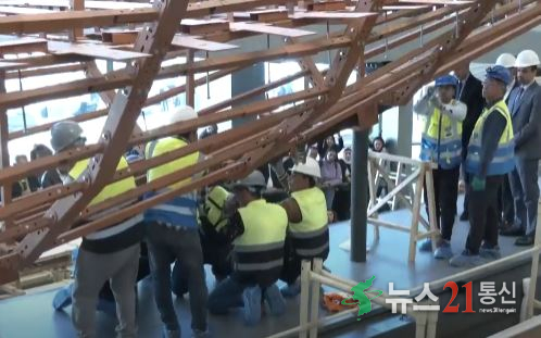 현지 시각 23일 시작된 복원 작업에서는 기다란 삼나무 조각들이 작업자들의 손을 거쳐 하나씩 옮겨졌다.