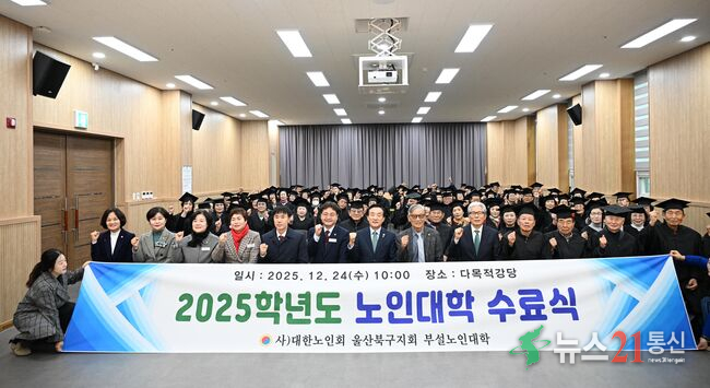 대한노인회 북구지회 부설 노인대학 수료식이 24일 시니어행복나눔센터에서 열린 가운데 박천동 북구청장과 김상태 북구의회 의장이 수료생들과 기념촬영을 하고 있다.