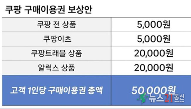쿠팡은 "와우회원·일반회원은 물론 탈퇴 고객까지, 지난 11월 말 개인정보 유출 통지를 받은 3천 3백 70만 계정의 고객에게 로켓배송·로켓직구 등 쿠팡 전 상품 5천 원권, 쿠팡이츠 5천 원 권, 쿠팡트래블 상품 2만 원 권, 알럭스 상품 2만 원 권 등 고객당 총 5만 원 상당의 4가지 구매 이용권을 지급한다"고 밝혔다.