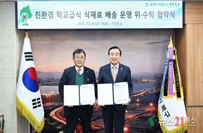 북구와 농소농협은 26일 북구청장실에서 친환경 학교급식 식재료 배송 운영을 위한 위·수탁 협약을 체결했다. 박천동 북구청장과 정성락 조합장이 협약서에 서명 후 기념촬영을 하고 있다.