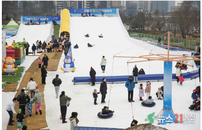 서울 성동구 행당동 무지개텃밭에 ‘성동구 무지개 눈썰매장’이 12월 31일부터 내년 2월 8일까지 운영된다. 대형 슬로프(폭 17m, 길이 70m)와 소형 슬로프(폭 11m, 길이 40m), 눈놀이터, 회전썰매, 미니기차 등 다양한 실외 체험 시설이 마련됐다.