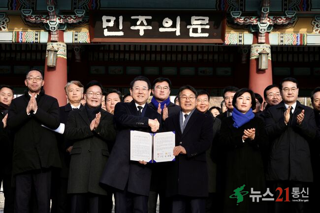 [뉴스21통신/장병기 기자] 광주광역시와 전라남도가 「광주·전남 행정통합 추진협의체」를 공식 발족하며, 대한민국 최초의 광역통합 지방정부 출범을 향한 본격적인 행보에 나섰다. 12일 나주 전남연구원에서 열린 발족식에는 강기정 광주시장, 김영록 전남지사, 추진협의체 위원 등 30여 명이 참석해 행정통합의 비전과 실행 방안을 ..