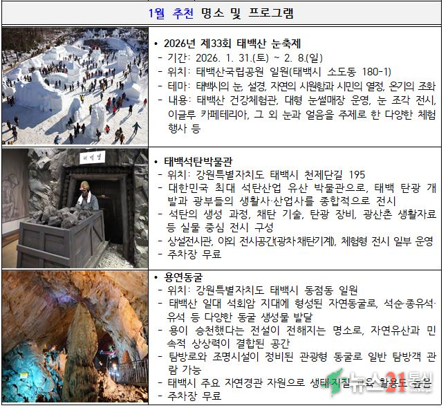 접근성과 탐방 동선이 잘 정비돼 겨울철에도 안전하게 경관을 감상할 수 있으며, 1월 말 열리는 태백산 눈축제와 연계해 관광객 체험 기회를 제공한다.