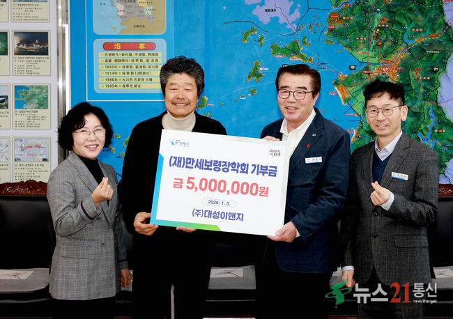 보령시는 5일 시장실에서 김동일 시장과 최정웅 ㈜대성이앤지 대표 등이 참석한 가운데 만세보령장학금 전달식을 가졌다.