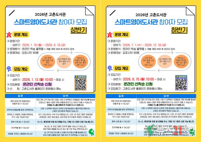 김포시(시장 김병수) 고촌도서관이 2026년 1월 19일부터 12월 18일까지 ‘2026년 스마트영어도서관’을 운영한다.