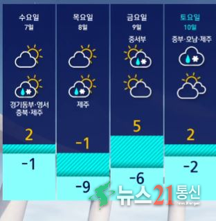 낮 기온은 춘천 3도, 대전 5도, 대구·광주 7도로 예상되며, 내일은 기온이 다시 오르다 목요일부터 강추위가 재차 찾아올 전망이다.