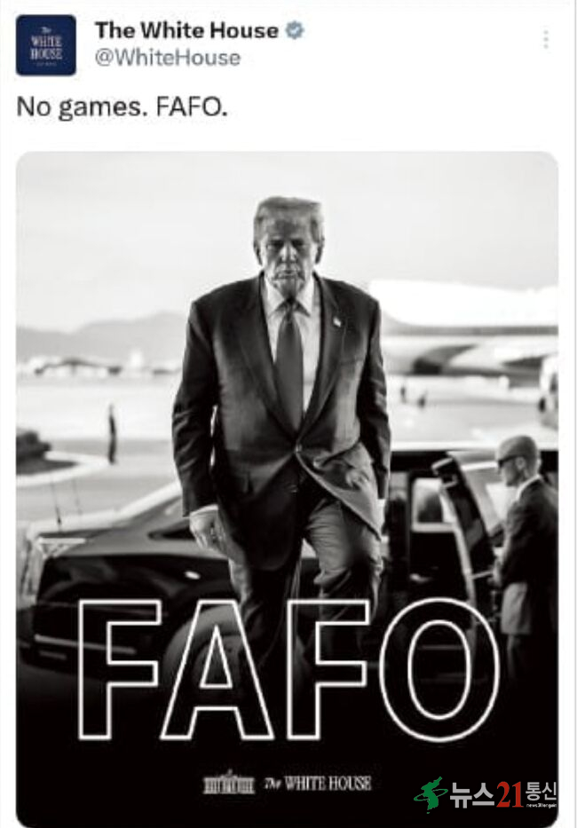 FAFO는 '까불면 다친다'(F**k AroundandFindOut)라는 의미의 미국 속어다. 백악관은 이 사진과 함께 '더 이상 게임은 없다. FAFO'라는 글을 함께 올렸다.