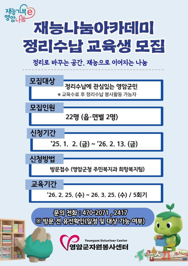 [뉴스21통신 김길용] 영암군(군수 우승희)은 군민의 재능기부 역량을 강화하고 지역사회 돌봄을 확대하기 위해 ‘2026년 재능나눔 아카데미(정리수납 과정)’ 참여자를 모집한다고 6일 밝혔다.