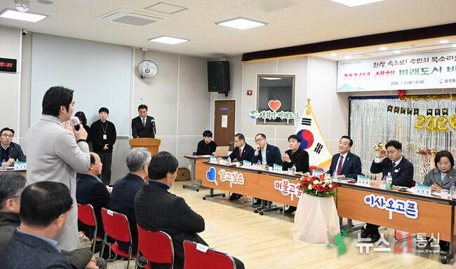 북구는 6일 송정동 행정복지센터에서 새해 미래도시 비전실현 현장토크를 열고, 주민 의견을 청취했다. 박천동 북구청장과 지역 시·구의원이 주민 의견을 듣고 있다.
