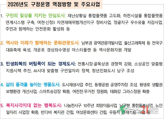 울산 남구(구청장 서동욱)는 어려운 재정 상황과 증가하는 복지 수요 등 대내외적 여건에 슬기롭게 대처하고 지속가능한 미래 100년 발전을 도모하기 위해 2026년도 5대 분야 구정운영 역점 방향을 선정했다.
