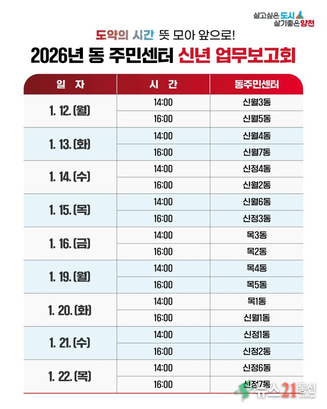 양천구(구청장 이기재)는 병오년 새해를 맞아 오는 12일부터 22일까지 ‘2026년 동 신년 업무보고회’를 열고, 주민과의 소통을 시작한다고 8일 밝혔다.
