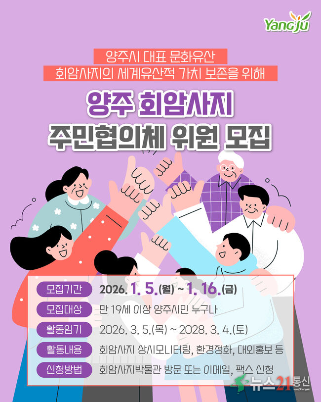 양주시는 회암사지 유네스코 세계유산 등재를 본격적으로 추진하기 위해 주민협의체 위원 10명 이내를 모집하며, 시민들이 직접 참여해 문화유산 보존과 홍보 활동에 기여할 수 있도록 했다.