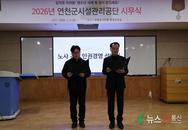 연천군시설관리공단은 1월 2일 시무식과 함께 노사 공동 인권경영 선언식을 개최하며, 새해를 맞아 인권 중심의 경영을 실천하고 상호 존중하는 조직문화를 강화하기 위한 첫 걸음을 내디뎠다.