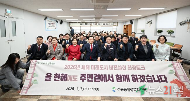 북구는 7일 강동동 행정복지센터에서 새해 미래도시 비전실현 현장토크를 열고, 주민 의견을 청취했다. 박천동 북구청장과 김상태 북구의회 의장, 지역 시·구의원 등이 주민들과 기념촬영을 하고 있다.