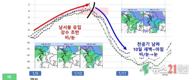 [뉴스21 통신=추현욱 ]8일 기상청에 따르면 9~10일 전국에 눈비가 내리고 강풍이 불겠다. 경기동부엔 10일 오전부터 오후까지, 강원내륙·산지에 10일 새벽부터 저녁까지 시간당 1~3㎝의 눈이 쏟아질 가능성이 있고, 강원내륙·산지 일부엔 시간당 5㎝ 안팎의 폭설이 내릴 수 있겠다.