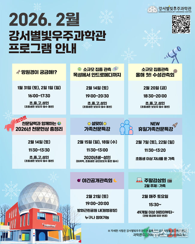 이번 프로그램은 ▲망원경이 궁금해!? ▲앙코르! 2026년 천문현상 특강 ▲설맞이 가족 천문특강 ▲소규모 집중관측 등으로 구성됐다.