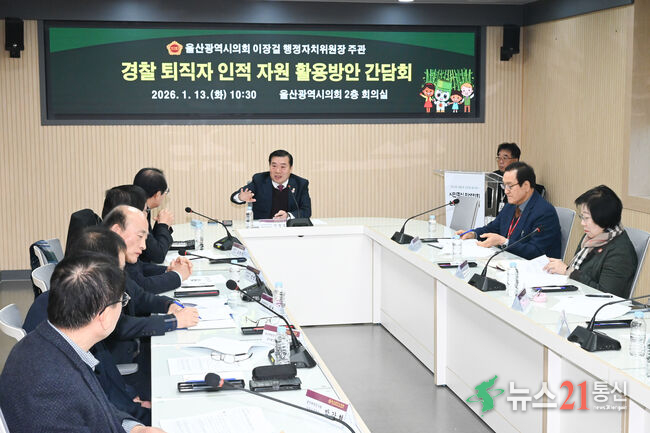 [뉴스21 통신=최세영 ]행정자치위원회 이장걸 위원장은 1월 13일(화) 오전 10시 30분, 시의회 2층 회의실에서 퇴직 경찰관 인적자원 활용 방안 마련을 위한 간담회를 개최했다. 이날 간담회에는 울산광역시 자치경찰위원회, 울산광역시 재향경우회 등 단체 관계자들이 참석하여 퇴직 경찰관의 풍부한 현장경험과 전문성을 지역사회 공익 활동에...
