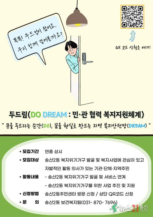 의정부시 송산2동주민센터(동장 황보경)는 복지 사각지대 해소와 촘촘한 지역복지 안전망 구축을 위해 2026년 새롭게 도입하는 ‘두드림(DO DREAM: 민관 협력 복지지원체계)’의 참여 주체를 모집한다고 밝혔다.이번 모집은 지역 내 공공과 민간이 협력해 위기가구를 조기에 발굴하고 맞춤형 복지서비스를 함께 추진하기 위한 민관 공동..