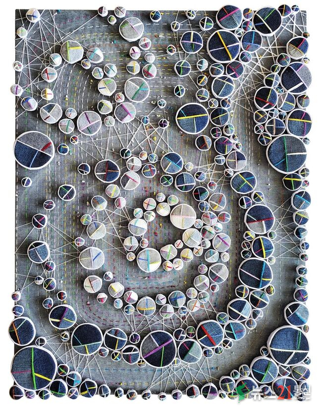 이번 작품은 청바지의 천 조각에 섬세한 바느질을 더해 반입체적 점선을 표현해, 눈에 보이지 않는 시간의 흐름과 존재의 흔적을 시각적으로 형상화했다.