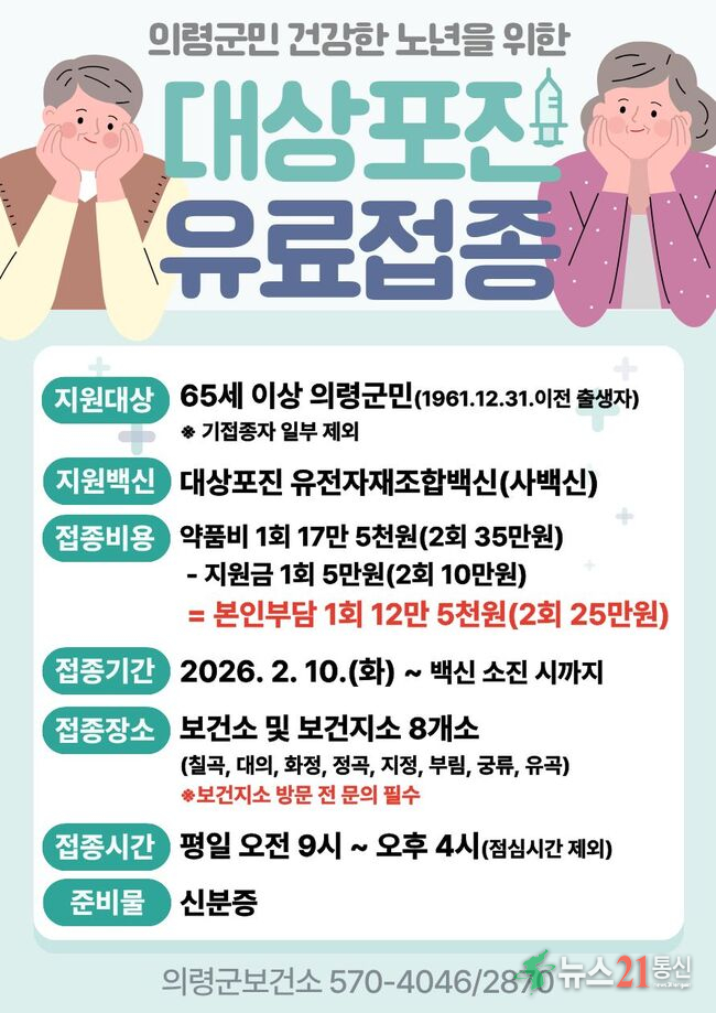 [뉴스21 통신=박철희 ] 의령군이 오는 10일부터 65세 이상 군민을 대상으로 대상포진 예방접종 지원사업을 본격 시행한다.