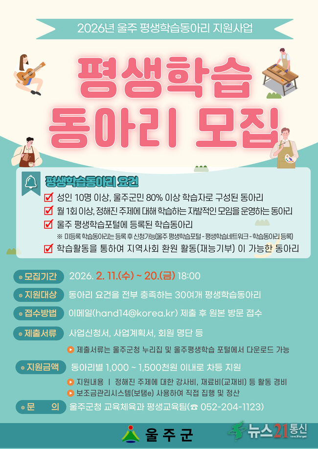울산 울주군이 오는 11일부터 20일까지 ‘2026년 우수 평생학습동아리 지원사업’ 참여 동아리를 모집한다고 5일 밝혔다.