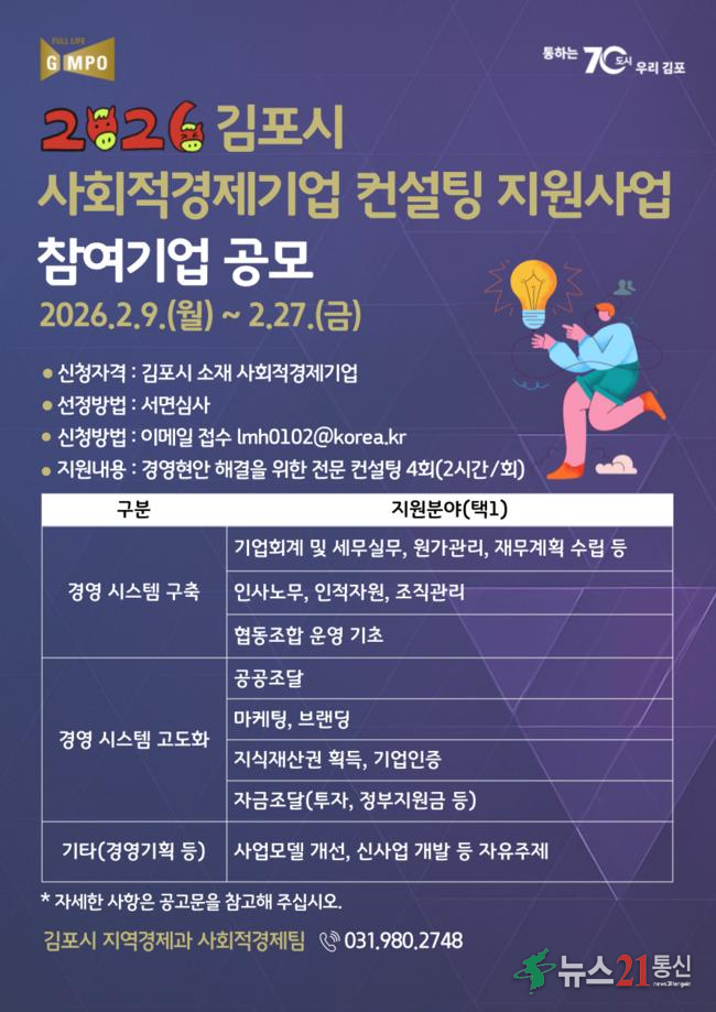 김포시(시장 김병수)가 관내 사회적경제기업의 지속 가능한 성장과 자생력 강화를 위해 ‘사회적경제기업 역량강화 컨설팅 지원사업’ 참여기업을 오는 2월 27일(금)까지 모집한다.