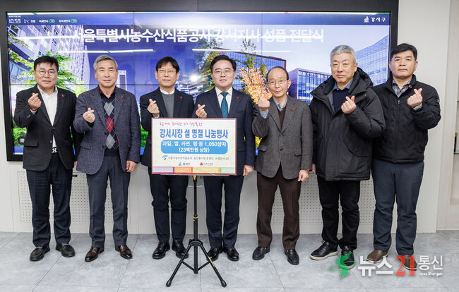 이날 강서구청장실에서 열린 이웃돕기 성품 전달식에는 이봉준 서울농수산식품공사 강서지사장을 비롯해 농수산물시장, 시장도매인 연합회, 수협중앙회 강서공판장 관계자 등 10여 명이 참석했다.