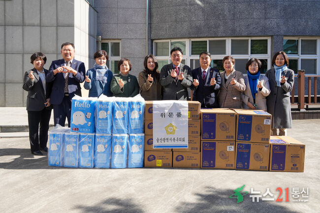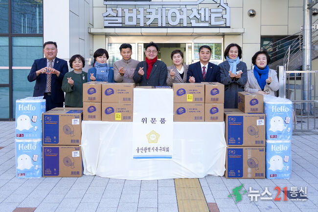북구의회 의원과 의회사무과 직원들은 9일 ‘설맞이 복지시설 방문 활동’으로 중산동의 ‘울산북구실버케어센터’를 찾아 휴지, 물티슈 등의 생필품을 전했다.