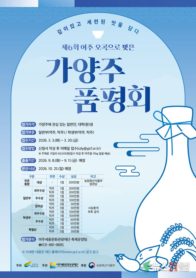 여주세종문화관광재단(이사장 이순열)이 오는 3월 3일부터 3월 20일까지 ‘제6회 여주 오곡으로 빚은 가양주 품평회’ 참가자를 모집한다.
