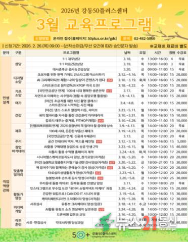 서울 강동구(구청장 이수희)는 오는 2월 26일부터 강동50플러스센터 3월 교육 프로그램 수강생을 모집한다고 밝혔다.