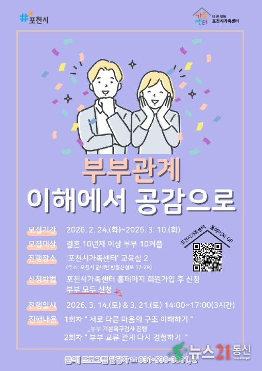 포천시가 직영하는 더 큰 행복 포천시가족센터는 오는 24일부터 결혼 10년 이상 부부를 대상으로 한 관계 증진 프로그램 ‘부부 관계 이해에서 공감으로’ 참여자를 모집한다.