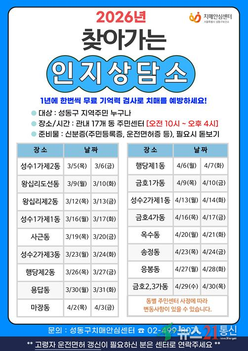 서울 성동구 치매안심센터는 3월 5일부터 4월 30일까지 17개 동 주민센터를 순회하며 치매 조기 검진을 실시하는 ‘2026 찾아가는 인지상담소’를 운영한다고 밝혔다.