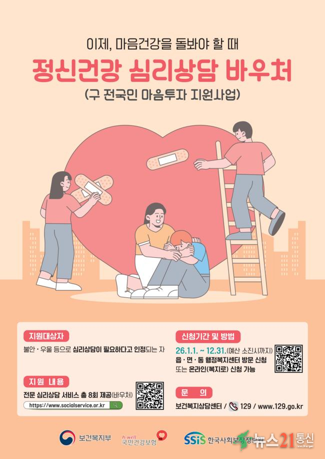 김철영 건강증진과장은 “정신건강 문제는 누구나 겪을 수 있는 만큼 조기에 상담과 도움을 받는 것이 중요하다”며, “심리적 어려움을 겪는 시민들이 심리상담 서비스를 통해 도움을 받길 바란다”고 말했다.