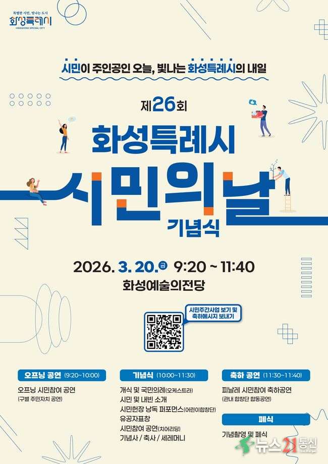 한편, ‘제26회 화성특례시민의 날’ 기념식은 3월 20일 오전 10시 화성예술의전당에서 열린다. 이번 기념식은 ‘시민이 주인공인 오늘, 빛나는 화성특례시의 내일’이라는 슬로건과 함께 시민이 무대를 꾸미는 참여형 행사로 진행된다.