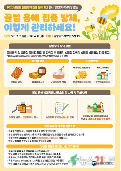 강원특별자치도(도지사 김진태)는 봄철 꿀벌 활동이 활발해지는 시기를 맞아 꿀벌 응애로 인한 피해를 최소화하기 위해 3월 9일(월)부터 4월 6일(월)까지 4주간 ‘봄철 꿀벌 응애 집중 방제 기간’을 운영한다고 밝혔다.