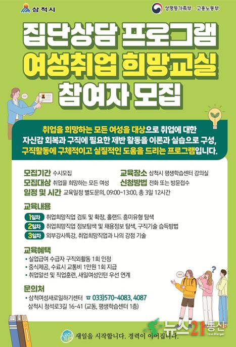 삼척여성새일센터는 취업을 희망하거나 준비 중인 모든 여성을 대상으로 집단상담 프로그램 ‘여성취업 희망교실’ 참여자를 연중 수시 모집한다.