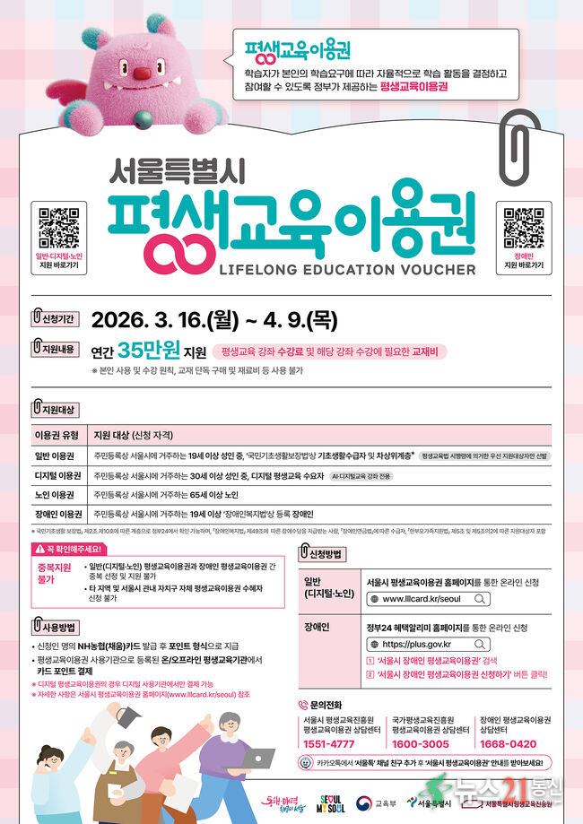 서울 강서구(구청장 진교훈)는 4월 9일(목)까지 ‘2026년 평생교육이용권’ 지원 대상자를 모집한다.