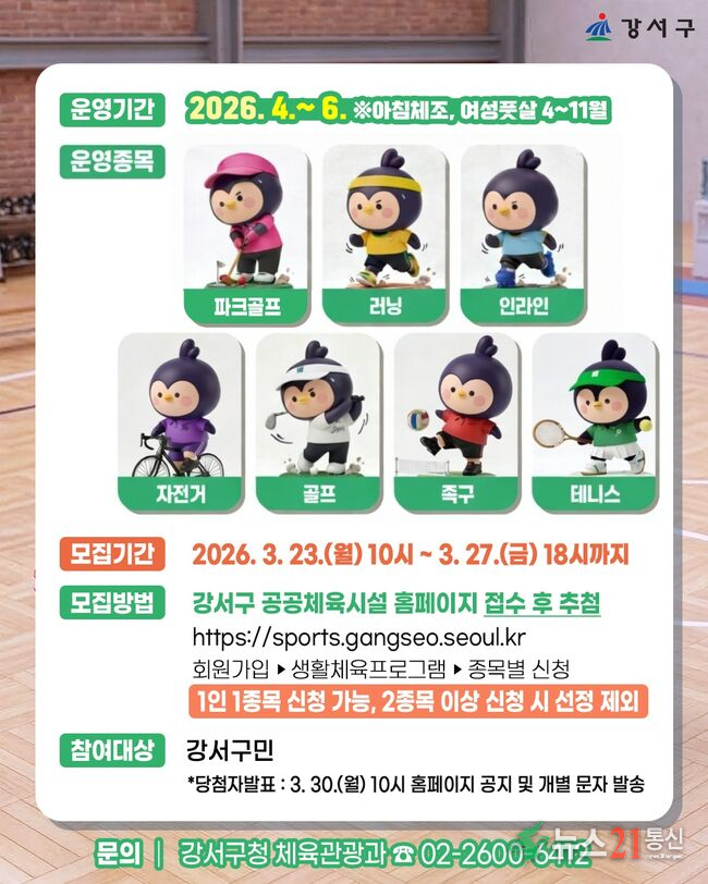 서울 강서구(구청장 진교훈)는 구민의 건강한 일상을 지원하기 위해 오는 3월 23일(월)부터 3월 27일(금)까지 2026년 상반기 생활체육교실 참가자를 모집한다고 밝혔다.