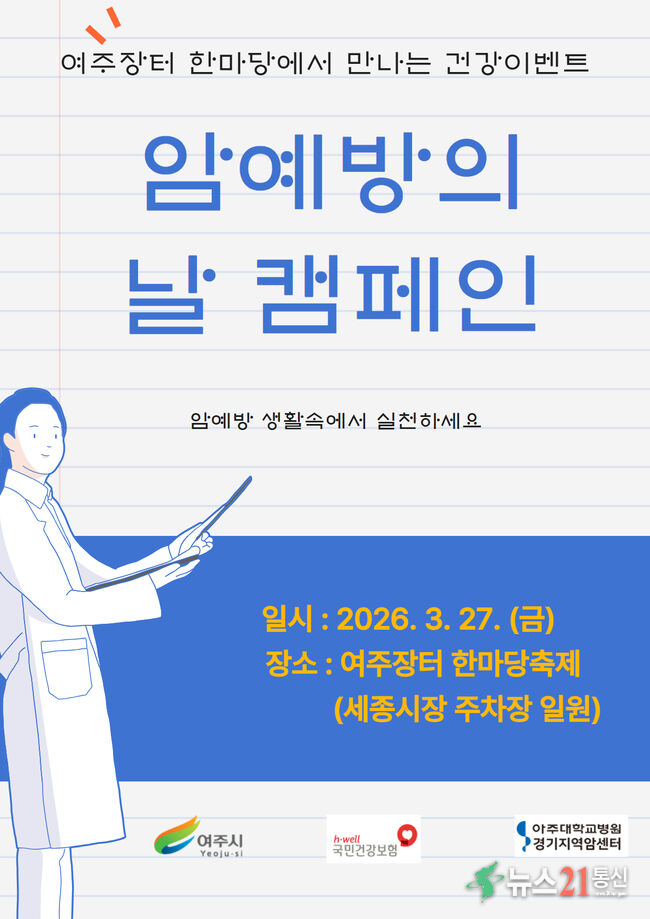 여주시 건강증진과(과장 길혜란)는 오는 3월 27일(금), 세종시장 주차장 일원 ‘여주장터 한마당 축제’ 현장에서 시민과 함께하는 암예방의 날 기념 캠페인을 운영한다.