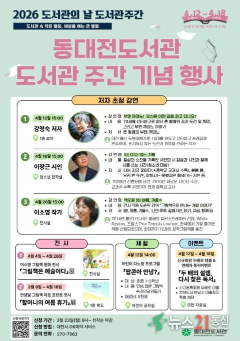 이번 행사는 ‘도서관 속 작은 펼침, 세상을 여는 큰 열림’을 슬로건으로, 4월 4일부터 26일까지 동대전도서관 1층 로비와 전시실, 청소년창작실 등에서 진행된다.