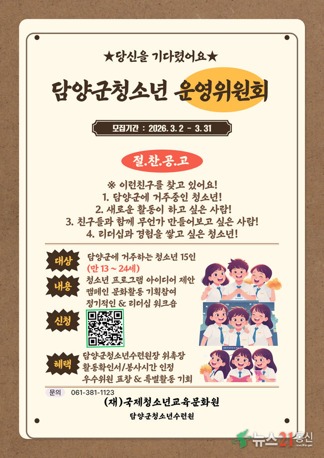 담양군청소년수련원(위탁운영 (재)국제청소년교육문화원)이 청소년들이 수련시설 운영에 직접 참여하고 창의적인 정책을 제안하는 ‘청소년운영위원회’ 신규 위원을 오는 3월 31일까지 모집한다.