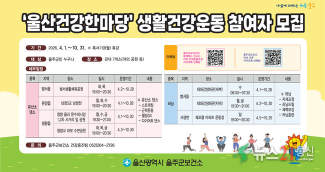사진제공:울주군청울주군보건소가 다음달 1일부터 오는 10월 31일까지 ‘울산 건강 한마당’ 생활 건강운동 교실을 운영한다고 23일 밝혔다.