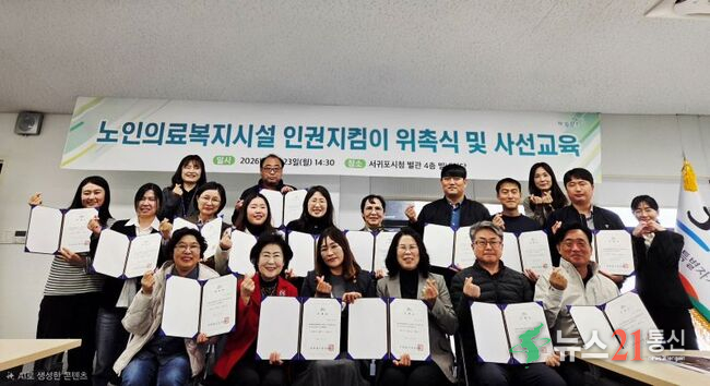 서귀포시는 지난 23일 노인의료복지시설 내 노인학대에 대한 사전적 예방과 인권존중문화를 확산시키기 위해, 지역사회 참여 기반의 인권모니터링 체계 구축을 위한 노인의료복지시설 인권지킴이 21명을 위촉했다고 밝혔다.