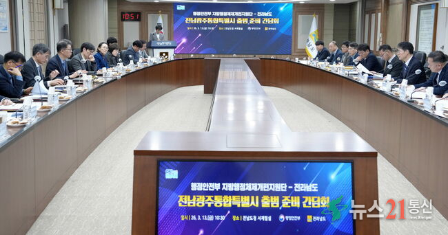 전남광주통합특별시 출범 준비 간담회[뉴스21통신/장병기] 전라남도는 전남광주통합특별시의 성공적 출범을 위해 실무준비단 확대와 핵심과제 수립 등 도정 전 분야에 걸친 통합 준비 절차 추진에 속도를 내고 있다.
